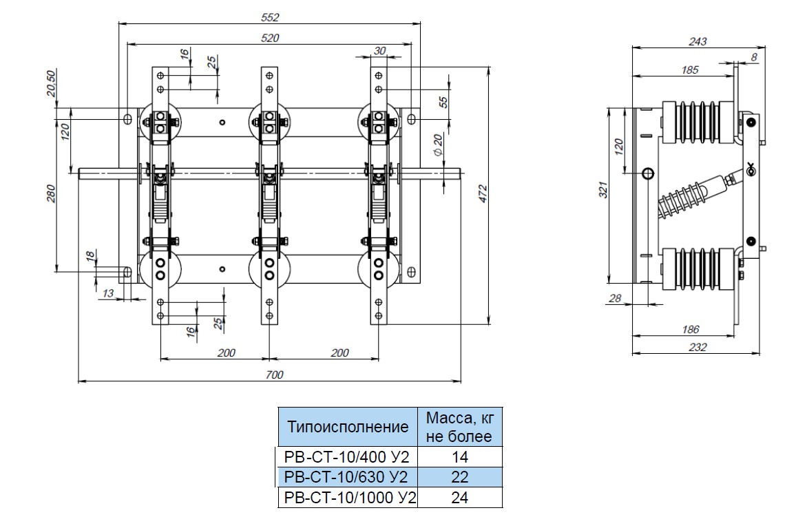 Высоковольтные разъединители внутренней установки РВ-СТ-10/400 (630, 1000) У2 совместно с приводом ПР-10-СТ предназначены для включения и отключения под напряжением участков электрической цепи напряжением до 10 кВ при отсутствии нагрузочного тока или для изменения схемы соединения, а также заземления отключенных участков при помощи стационарных заземлителей при их наличии.