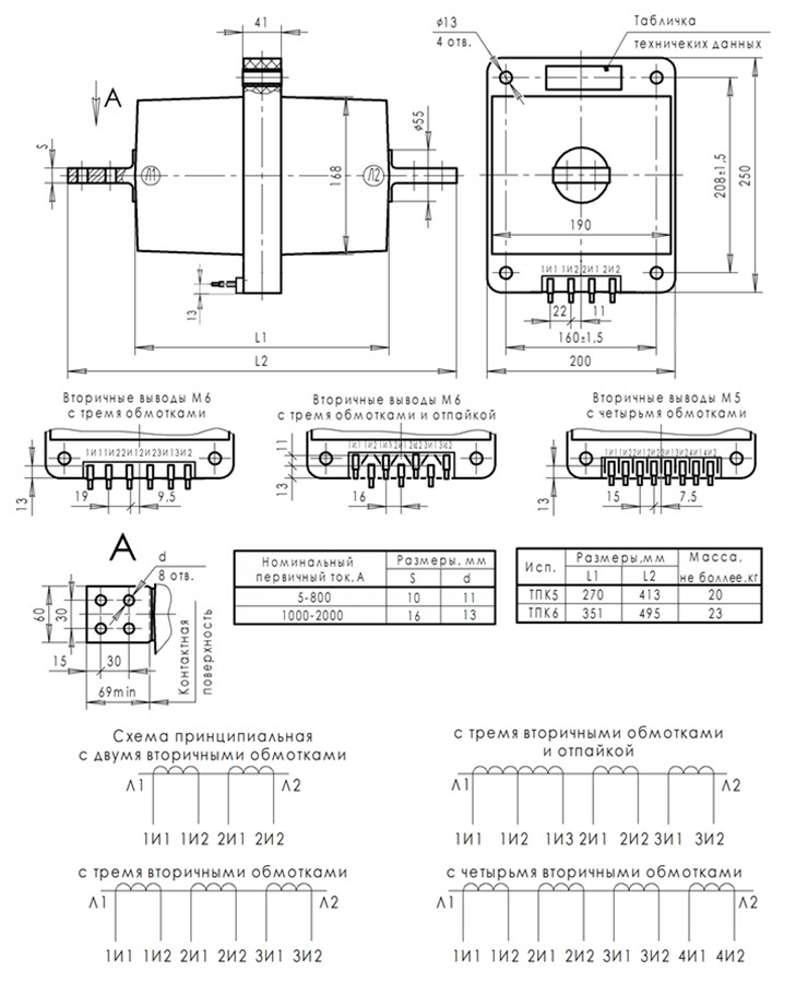 Трансформатор тока (ТОЛ) ТЛК-СТ-10-ТПК5 (1000А-2000А) с габаритом 413х200х250 мм (2 или 3 вторичные обмотки). Наконечники от 1000А до 2000А. Места крепления 160х208 мм. 2 или 3 вторичные обмотки с гибкими вторичными выводами из провода ПВ-3 расположены горизонтально.