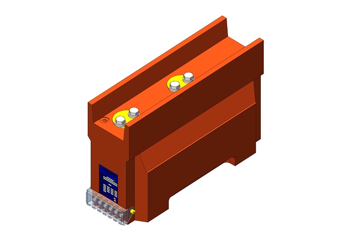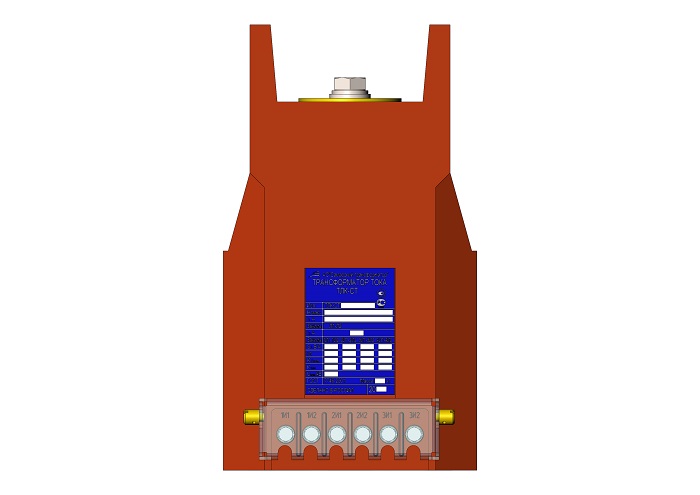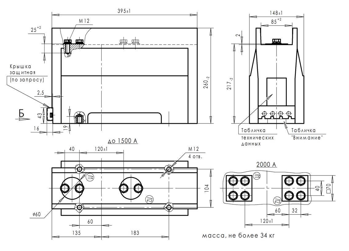 Трансформатор тока (ТОЛ) ТЛК-СТ-10-12М1 (5А-1500А) в габарите 395х148х260 мм без металлического основания, без паза под вторичные выводы и круглыми первичными наконечниками диаметром 60 мм с размером 40 мм между отверстиями для крепления подводящих шин, с изоляционными барьерами (85 мм) возле первичных наконечников. С защитной крышкой вторичных выводов и увеличенный размер по длине (3 или 4 вторичные обмотки). Наконечники до 1500А.