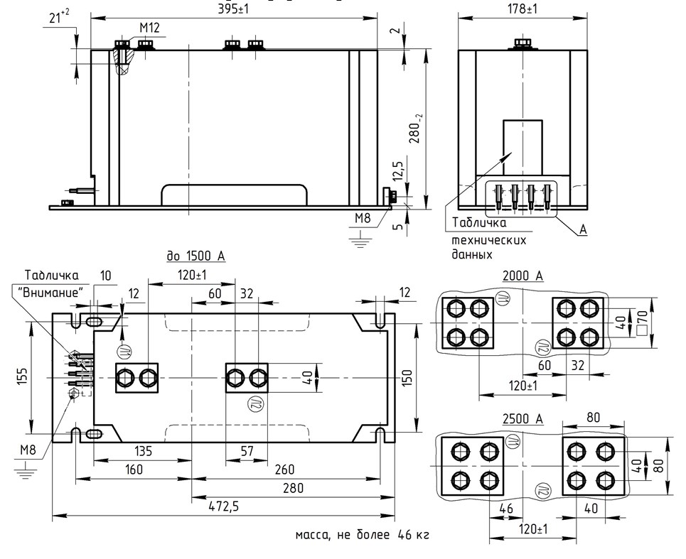 Трансформатор тока (ТОЛ) ТЛК-СТ-10-13.2 (2000А) в габарите 395х178х230 мм с металлическим основанием и прямоугольными первичными наконечниками с размером 32 мм между отверстиями для крепления подводящих шин. Увеличенный размер по длине, ширине и по высоте 280 мм, 2, 3, 4, 5 вторичные обмотки. Гибкие вторичные выводы из провода ПВ-3 расположены горизонтально. Наконечники 2000А..