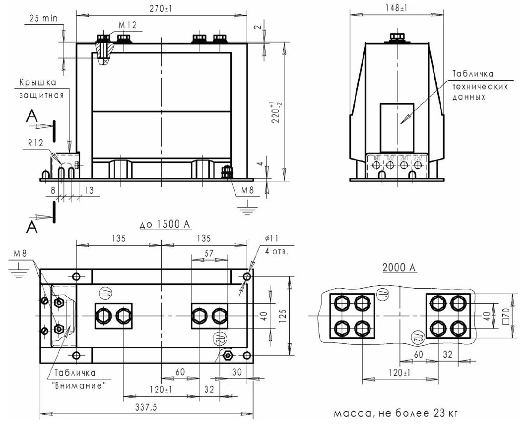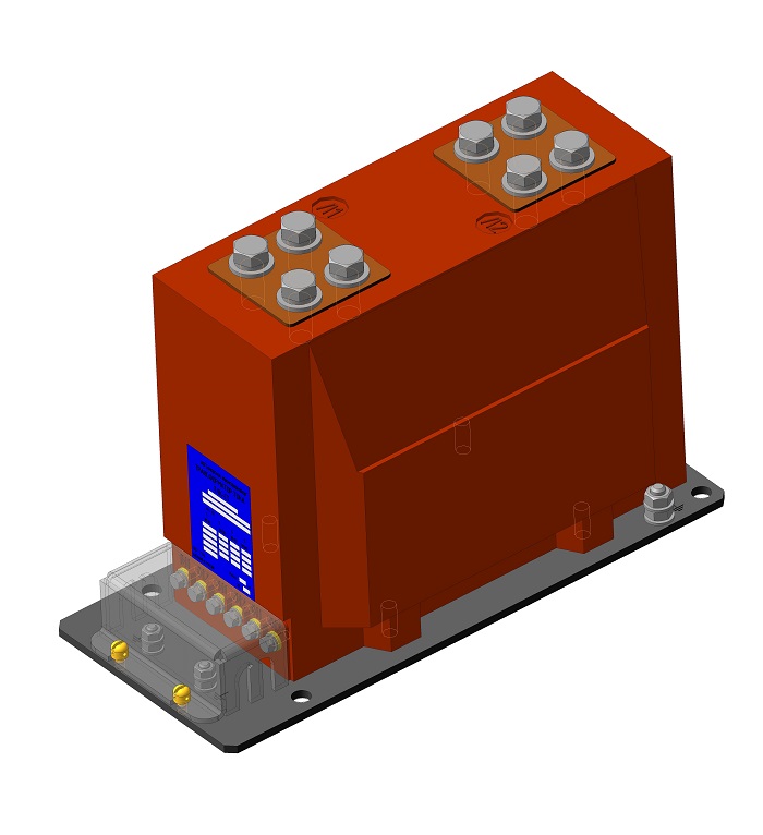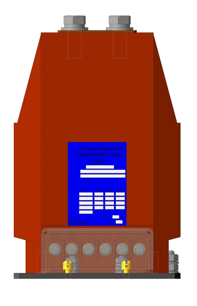 Трансформатор тока (ТОЛ) ТЛК-СТ-10-4 (2000А) в габарите 270х148х222 мм с металлическим основанием и прямоугольными первичными наконечниками с размером 32 мм между отверстиями для крепления подводящих шин. С защитной крышкой вторичных выводов. Наконечники до 2000А.