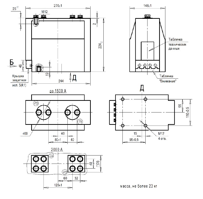 Трансформатор тока (ТОЛ) ТЛК-СТ-10-5(4.1) (2000А) в габарите 270х148х224 мм без металлического основания, с пазом под вторичные выводы. Обратная полярность по обозначениям первичной обмотки Л1 и Л2. Вторичные выводы расположены горизонтально (2 или 3 вторичные обмотки). С защитной крышки вторичных выводов. Наконечники 2000А.
