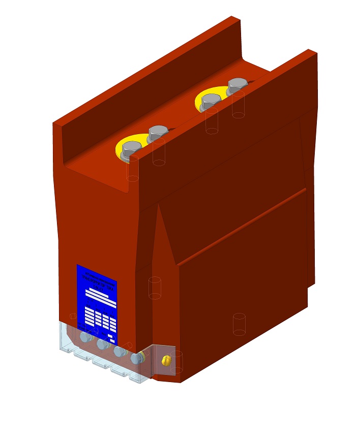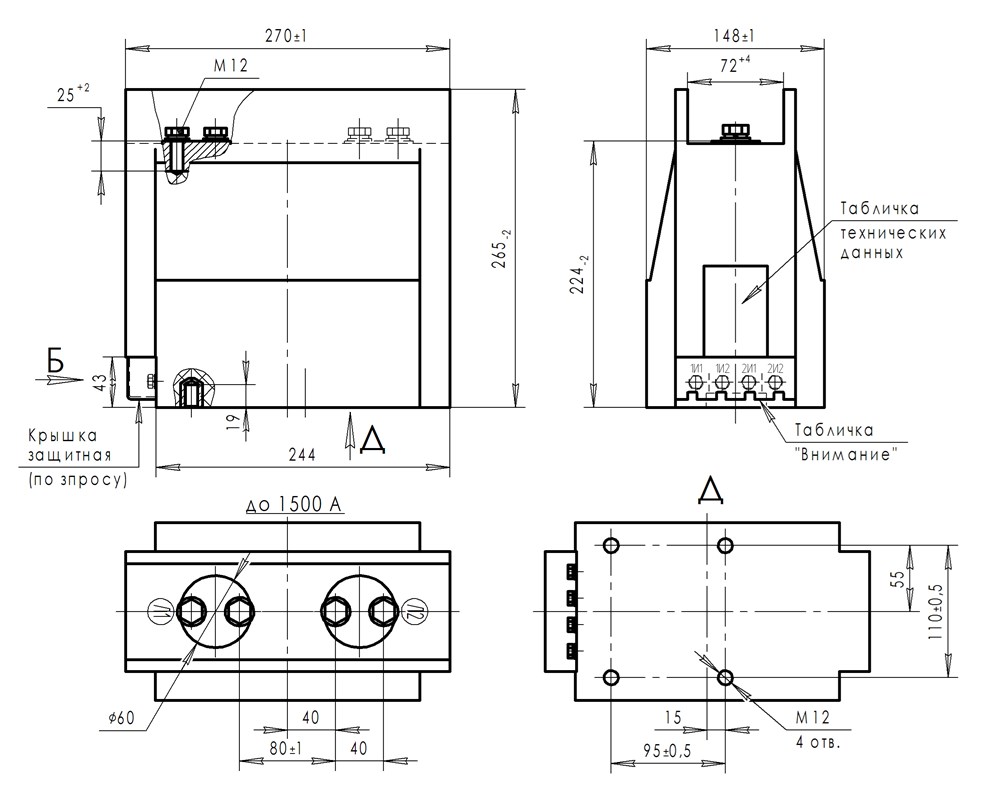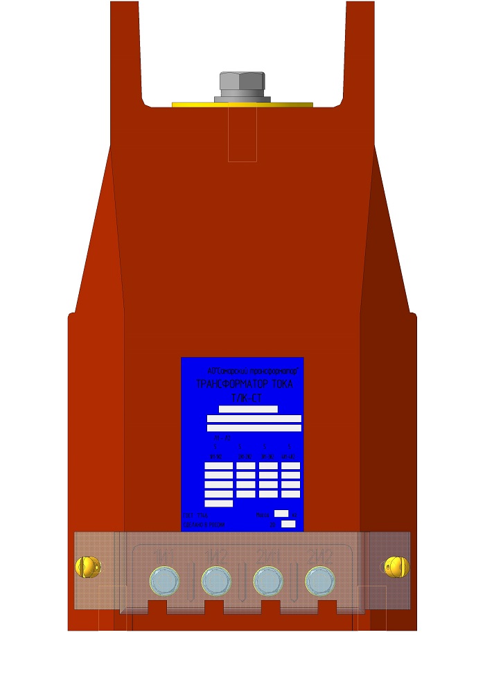 Трансформатор тока (ТОЛ) ТЛК-СТ-10-5М(1) (5А-1500А) в габарите 270х148х265 мм без металлического основания, с пазом под вторичные выводы , с изоляционными барьерами (72 мм) возле первичных наконечников и круглыми первичными наконечниками диаметром 60 мм с размером 40 мм между отверстиями для крепления подводящих шин. Вторичные выводы расположены горизонтально (2 или 3 вторичные обмотки). С защитной крышкой вторичных выводов. Наконечники до 1500А.