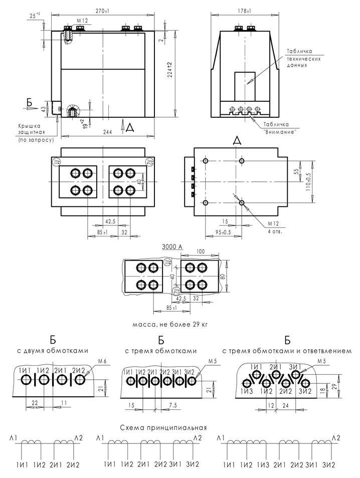 Трансформатор тока (ТОЛ) ТЛК-СТ-10-7.2(1) (3000А) в габарите 270х178х224 мм увеличенный только по ширине (178 мм) без металлического основания, с пазом под вторичные выводы и первичный ток 3000А, прямоугольные наконечники 80х100 мм. Вторичные выводы расположены горизонтально (2 или 3 вторичные обмотки). С защитной крышкой вторичных выводов.