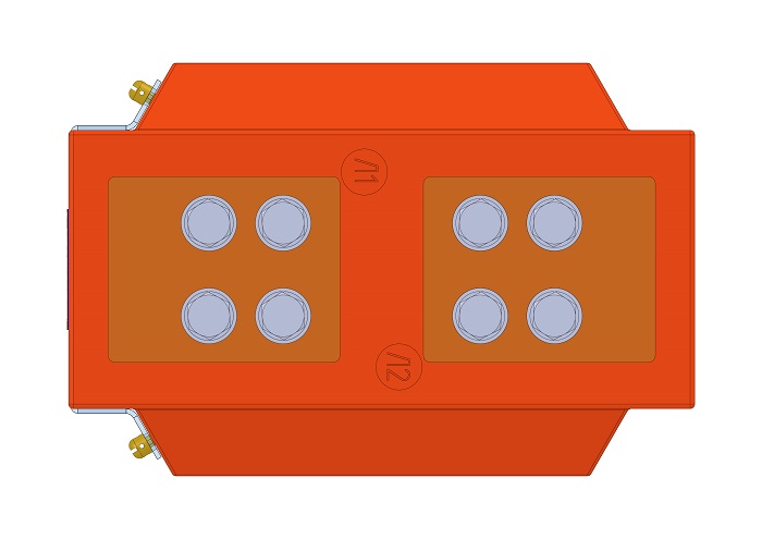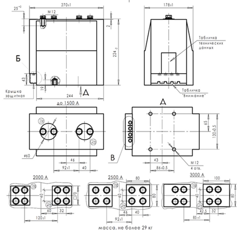 Трансформатор тока (ТОЛ) ТЛК-СТ-10-7.4(1) (3000А) в габарите 270х178х224 мм без металлического основания, с пазом под вторичные выводы. Вторичные выводы расположены горизонтально (2 или 3 вторичные обмотки). С защитной крышкой вторичных выводов. Наконечники 3000А прямоугольные 80х100 мм. Отличается размерами под закладные спецгайки крепления трансформатора (130х86 мм).