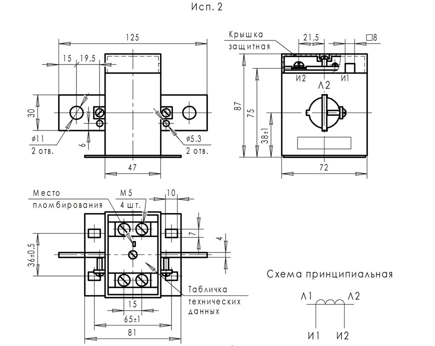 Трансформатор тока Т-0,66-2 (100А-400А) исполнение-2 в габарите корпуса 73х88х48 мм на фланце с первичной обмоткой – шина и первичным током 100А-400А. С защитной крышкой. Вторичный ток 5А или 1А.